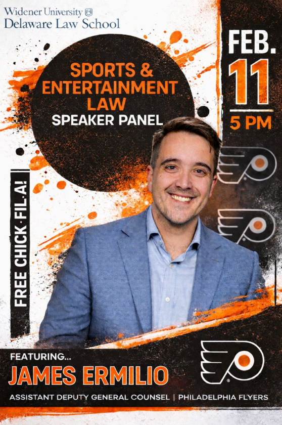 SELA's Spring Speaker Panel guest is James Ermilio, the Assistant Deputy General Counsel for the Philadelphia Flyers and Xfinity Mobile Arena. While in law school at the University of Pennsylvania, James interned with Major League Baseball, Madison Square Garden, and the Special Masters of the NFL Concussion Settlement. James will discuss breaking into these fields, day-to-day practice, and trends at the intersection of sports and law, followed by Q&A